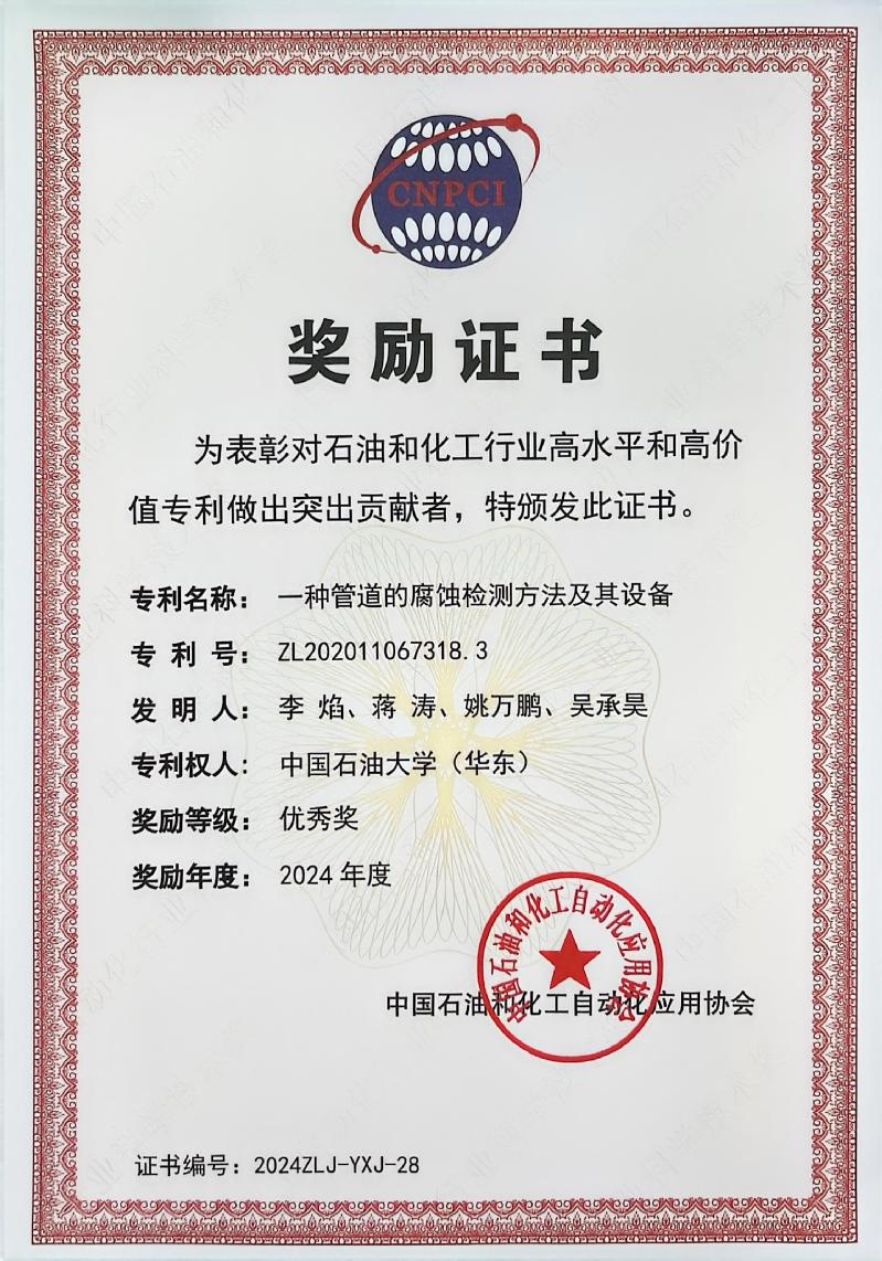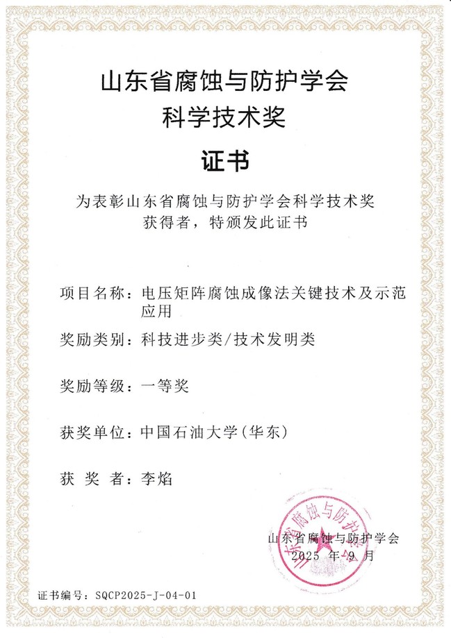 近期,学院李焰教授团队在智能腐蚀监测领域取得一系列重要进展。通过为期十年的自主创新研究和产学研深度协作,团队逐步攻克电压矩阵成像法腐蚀监测技术在国内石油、化工行业应用的瓶颈,研发成功了具有自主知识产权的智能腐蚀监测与评估成套技术及装备,并连续获得2024年度中国石油和化工自动化行业专利奖优秀奖、2024年ni(美国国家仪器公司)全国用户案例与创意大赛优秀价值奖和2025年山东省腐蚀与防护学会科学技术奖一等奖等奖励,这标志着材料学院在能源装备腐蚀控制领域的发展过程中又迈出坚实一步。
